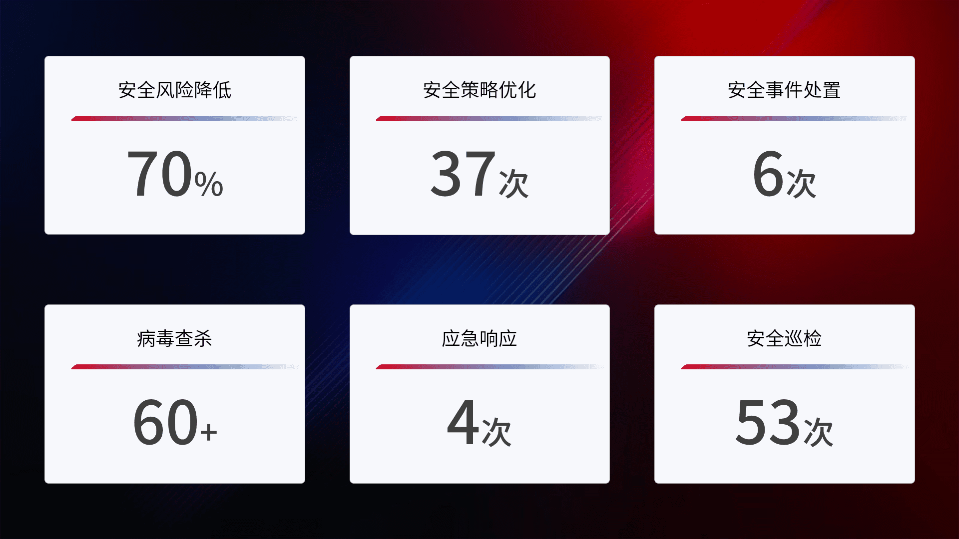 提供全面的安全事件报告体系,,,,包括处置报告、、周报、、季度和年度总结,,,,结合持续监控,,帮助客户深入了解网络安全状况。。