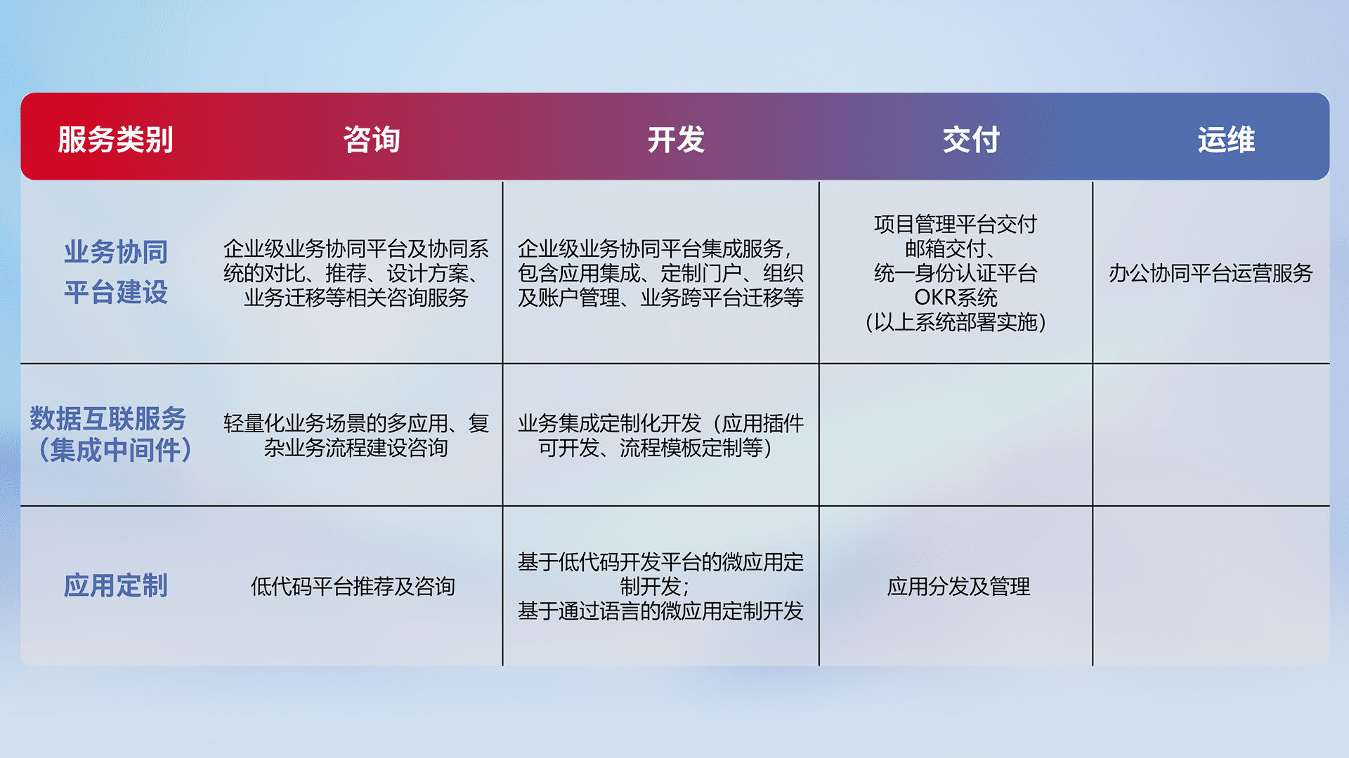针对钉钉、、企微、、、IDaas等平台级产品提供产品的规划、、、方案、、、、交付、、、定制化开发等服务,,实现如统一协同办公、、智能客户服务、、混合会议管理、、智能数据查询、、等业务场景,,,,实现数字化转型。。